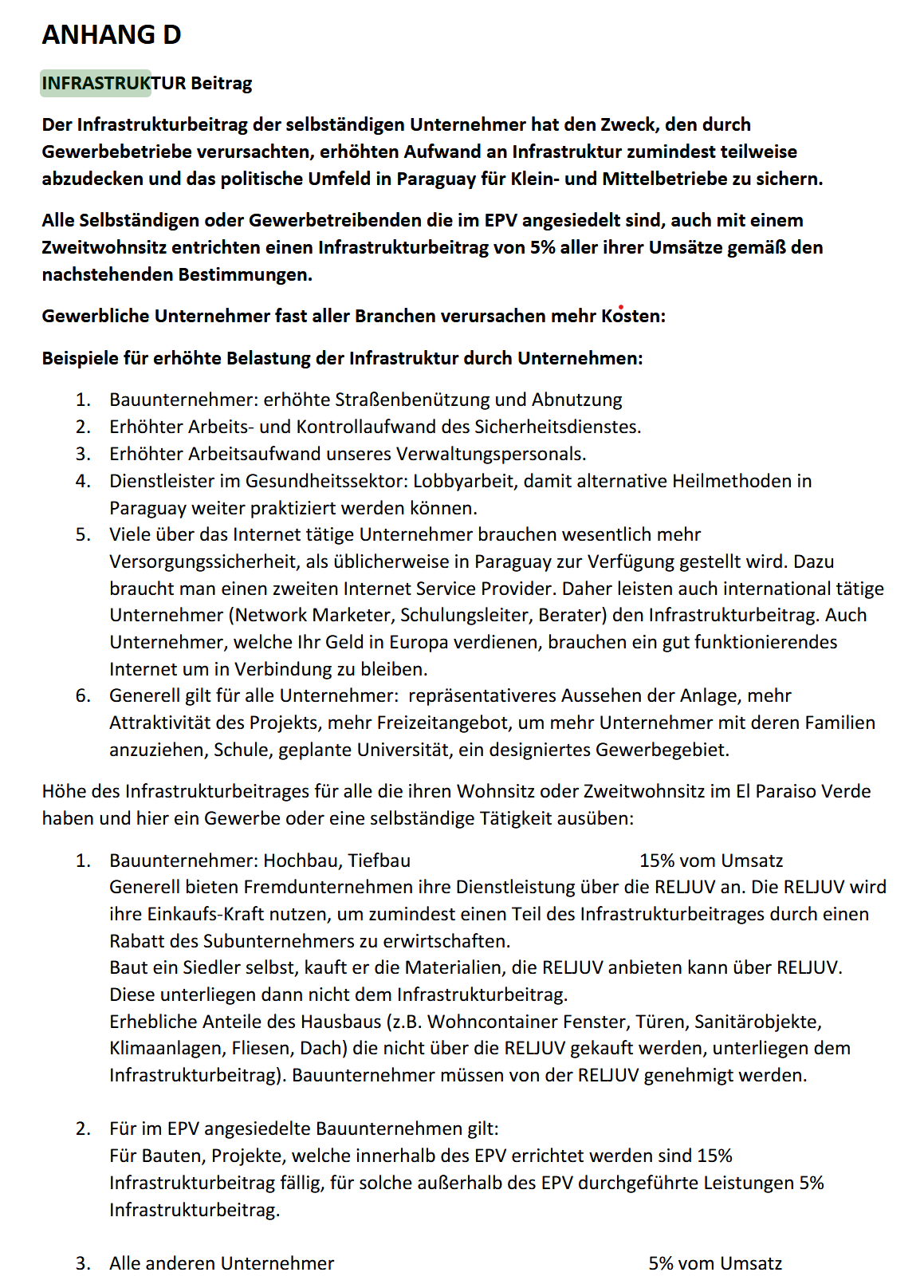 Anders als die Erhaltungsbeiträge werden die Infrastrukturbeiträge nicht von jedem Investor gezahlt, sondern nur von solchen, die auf irgendeine Art Einkommen generieren. Es handelt sich also um eine Art Steuer, die die Firma Reljuv hier für sich in Anspruch nimmt. Die Beiträge bemessen sich daher auch nicht an der Grundstücksfläche sondern am von dem Siedler generierten Umsatz.