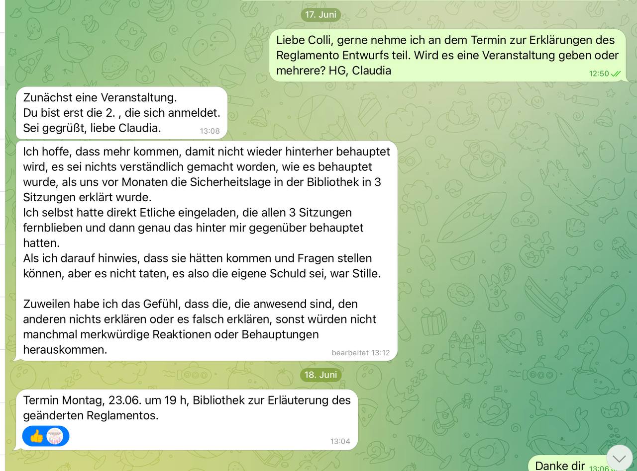 und einem Reljuv-Versprechen, ein neues Reglamento als Entwurf zur Diskussion vorzulegen. Das sollte bis Ende März zur Verfügung stehen! Auf meine Nachfrage vom 01.04.2025 erhielt ich natürlich eine Begründung, warum dieser Termin nicht gehalten werden konnte. Die Siedler waren schuld und deshalb würde es noch bis Ende April dauern! (siehe Email vom 02.04.2025 Mailverkehr.pdf)