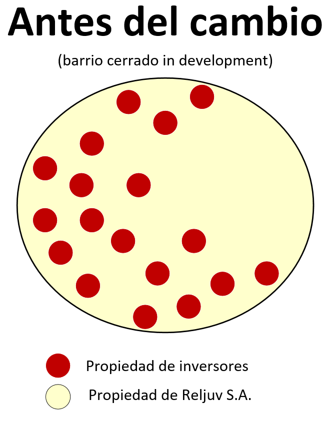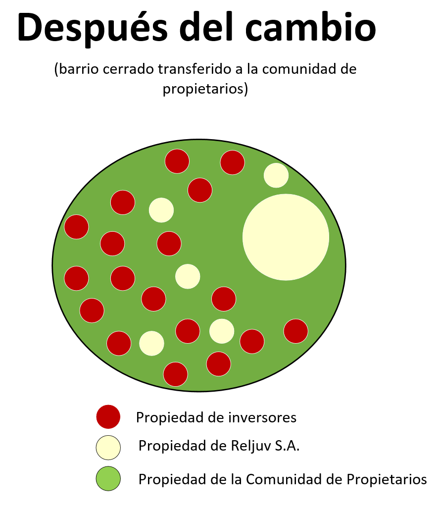 Toda la superficie se divide ahora en las parcelas individuales en propiedad privada de inversores o en propiedad privada de la empresa Reljuv S.A. y el 33% restante de la superficie total, que es propiedad común de la comunidad de propietarios. El círculo más grande pretende indicar que Reljuv es propietaria de superficies aún mayores que no están urbanizadas en modo alguno. Del mismo modo, varias zonas que con el tiempo serán propiedad común, como los lagos, aún no se han urbanizado en gran medida.